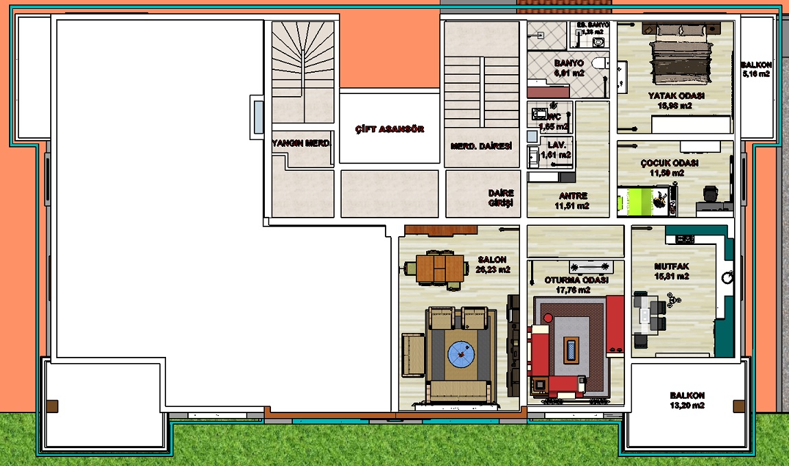2. Her dairede antre, 3 oda, 1 salon, 2 banyo, WC, lavabo, 2 balkon bulunmaktadır.