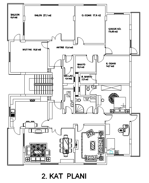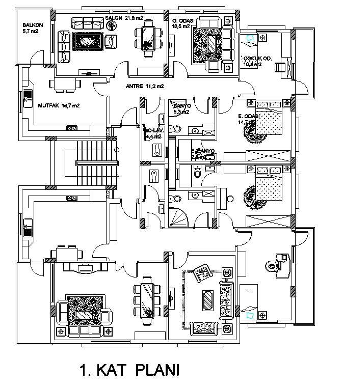 2. Her dairede antre, 3 oda, 1 salon, 2 banyo, wc, lavabo, 2 balkon bulunmaktadır.